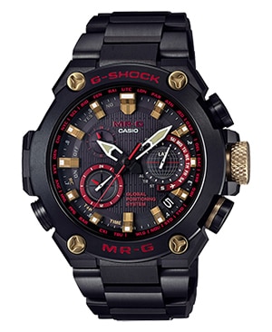 The MRG-G1000B-1A4 is equipped with a hybrid time acquisition system that receives both GPS and radio wave time-calibration signals, conveying G-SHOCK strength in a design theme of crimson accents that evoke the red lacquered armor that once signified elite samurai.