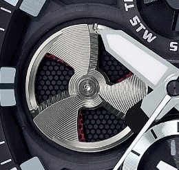 The GST-B100 and GST-B100D are the first watches in the G-STEEL series to feature analog chronographs. An iconic dial indicator at the nine o'clock position is designed in the bold image of the turbine blades on a jet aircraft engine. The dial indicator rotates to graphically indicate the elapsed stopwatch time, alarm on/off setting or battery level. The watches feature a high-power dual coil motor that drives the large dial indicators. The appealing rotation of the dial indicator and the multidimensional watch face make for a chronograph that is distinctively G-SHOCK.