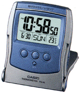 PQ-65 Series: These travel clocks include a temperature for instant read out of the current temperature in your hotel room or anywhere else your journey takes you. The protective case doubles as a stand, and everything folds up into a compact configuration at packing time.