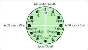 The 12 Chinese astrological signs use animal figures to represent years, hours, and compass points.