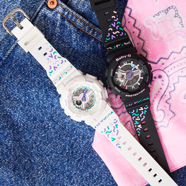 Colorful geometric patterns - BA-110THFrom BABY-G, the casual watch for active women, come new models marked with attractive geometric patterns. The base model is the popular mannish BA-110, which is decorated with colorful geometric patterns. The blocking of the band patterns creates a look that reflects the fashion trends of the 1990s. The hour markers and other parts are done in exciting colors for a pop image. These cool new models are just the thing to add a fashionable touch to your wrist.