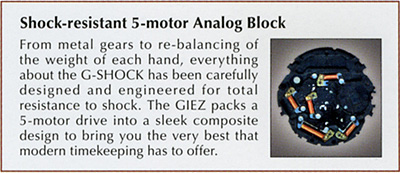 Five motors drive seven hands to provide a wealth of information that meets a variety of different needs. The signature functions of these models are a special stopwatch feature that displays speed and a full auto-calendar. Bold splashes of red, blue, yellow and other colors are laid out to maximize readability and ease of operation, while creating a motor sports look.