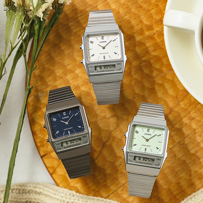 CASIO VINTAGE - Retro-modern LookArabic numeral hour markers and glossy face colors give these models a distinctive retro-modern look. The dial and the liquid crystal display are independent of each other, which provides both the aesthetics of analog and the functionality of digital. Square cases combine with metal segmented bands to create a stylish look. Convenient daily-life functions include stopwatch, alarm, and dualtime.