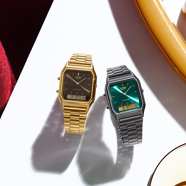 CASIO VINTAGEIndulge your love of vintage-inspired premium style with an analog-digital timepiece featuring a compact angular face. Based on the popular AQ-230, this watch delivers a classic, luxe look, with a sunray dial in dark green complemented by gold-colored hour and minute hands and bar indexes. Enjoy water resistance for daily use, as well as handy features like stopwatch, alarm, and more.