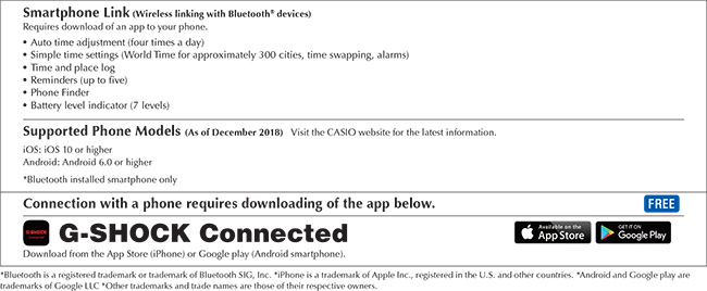 * Smartphone app for use with G-SHOCK Smartphone Link models. It establishes a Bluetooth connection with the watch's Connected Engine for automatic time correction, configuration of World Time and other settings, and more. It also makes it possible to keep updated with the latest time zone and summer time information. A Tough Solar power system generates enough energy to ensure uninterrupted operation of power-hungry functions.