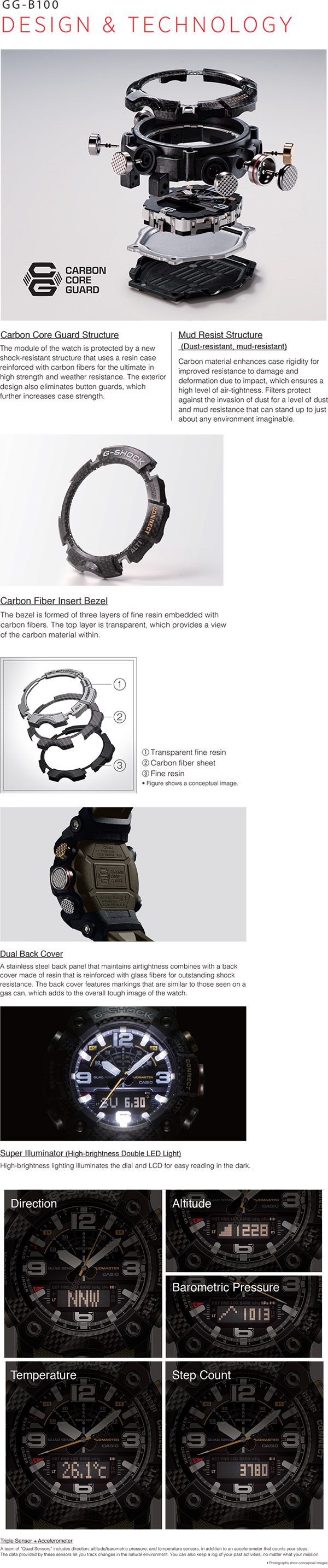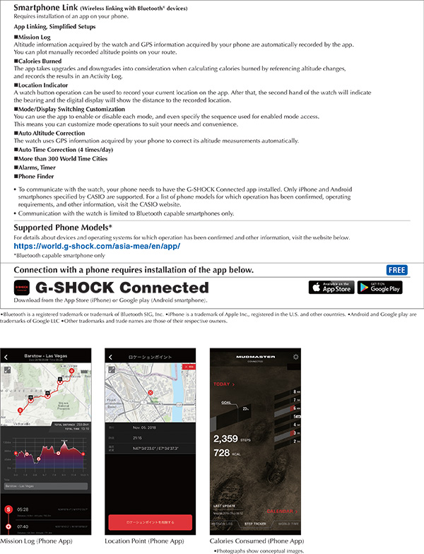 MUDMASTER - GG-B100Quad Sensor capabilities use compact sensors that make it possible to pack compass, altitude/barometer, and temperature measurements, along with an accelerometer that keeps track of your step count, into a compact configuration. This provides the outdoor adventurer with the means to keep track of the surrounding environment while on the go. A special G-SHOCK app, which simplifies configuration of watch settings, also includes a new Mission Function. The app automatically records altitude data measured by the watch and route information acquired by a smartphone's GPS. Manually obtained altitude points can be plotted on your route. Altitude measurement and the step count are used to perform consumed calorie calculations that take up and down grades into consideration, and to record the results in an activity log. A watch button operation can be used to record your current location with the app. Then the second hand indicates the bearing to the recorded location, while the digital display shows the distance to the location. These new models also support Mode Switching Customization. You can use the app to enable or disable modes individually so only enabled modes appear. You can even specify the sequence to be used when displaying the modes.- Mud resist structure (dust-resistant, mud-resistant)