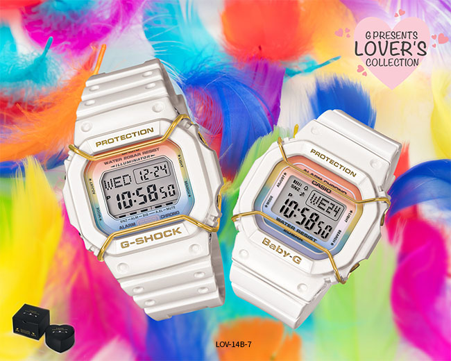 G PRESENTS LOVER'S COLLECTION 2014These two digital models are part of the Lover's Collection 2014 lineup of paired watches for lovers. The color theme of this year's models is white and pink gold. The base models for this pair are the DW-D5600P and the BGD-501, both of which are equipped with protectors. These models also feature rainbow color display frames to express happiness. The back cover is stamped with images of an angel and devil, and the year 2014, and the watches come in a special heart box that identifies them as something truly special.