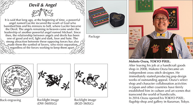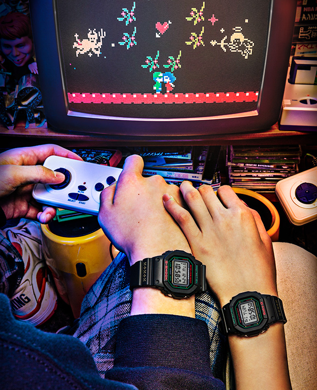 G PRESENTS LOVER'S COLLECTION 2019The LOV-19B models were designed under the direction of Makoto Oozu, owner of a shop named TOKYO PiXEL. The base models are the square face DW-5600 and BGD-560. The faces of these models are decorated with an 8-bit dot pattern boundary and characters. Everything about these watches makes them vivid reminders of the 1990s. The bands are decorated with the 8-bit dot characters "XOXO," which stand for "hugs and kisses." Basic black coloring is accented by red and green Christmas hues. Pressing the light button of the G-SHOCK model causes the image of mistletoe and a devil to appear on the screen. On the BABY-G model, the image of mistletoe and an angel appears. These models come in a special package decorated with pixel graphics, making them suitable as gift items for that someone special. These special models are perfect for two people wishing to spend Christmas Eve together.