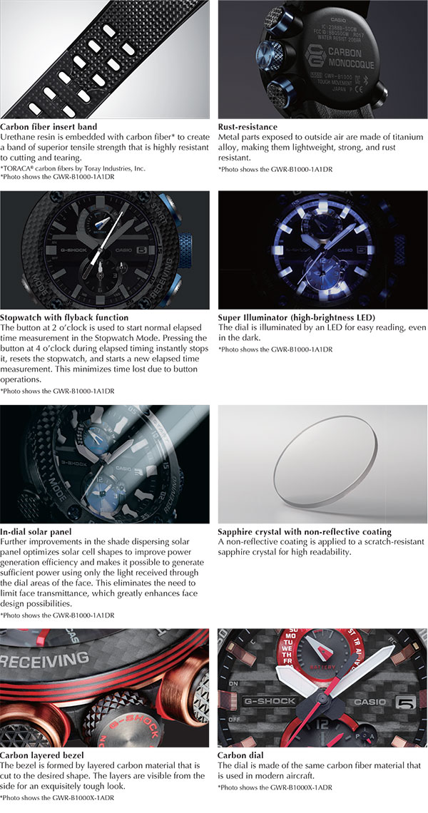 GRAVITYMASTERR Limited Edition Model - GWR-B1000XFrom GRAVITYMASTER, the tough watch designed for the severe environments faced by pilots, come new GWR-B1000 Series models with Carbon Core Guard structures. The case and back cover are integrated into a carbon monocoque configuration, and the carbon face incorporates CASIO original solar technology that maximizes power generation using the light that enters through the digital dial surfaces. G-SHOCK red brand coloring is embedded in the carbon bezel layers and around the dials. All of this adds up to a new G-SHOCK design that is tougher and more stylish than ever. The base model is the GWR-B1000 whose generous use of titanium and other highfunction materials creates a timepiece of outstanding toughness, light weight, and rust resistance. Automatic time adjustment is performed using either Bluetooth® or a time signal, which helps to ensure accurate timekeeping while flying on a mission.