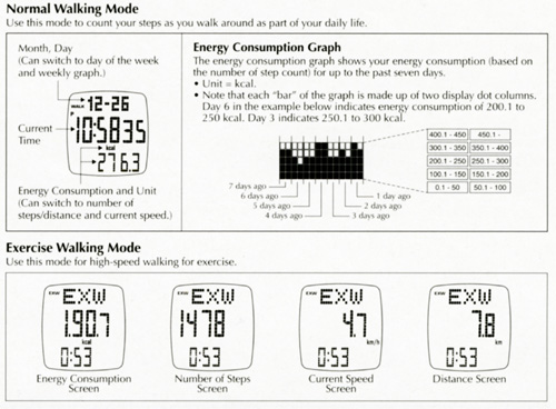 The watch maintains up to seven days of data for instant recall whenever you need it. You can select eighter a Normal Walking Mode or Exercise Walking Mode so the watch can adjust its calculations in accordance with your walking style.