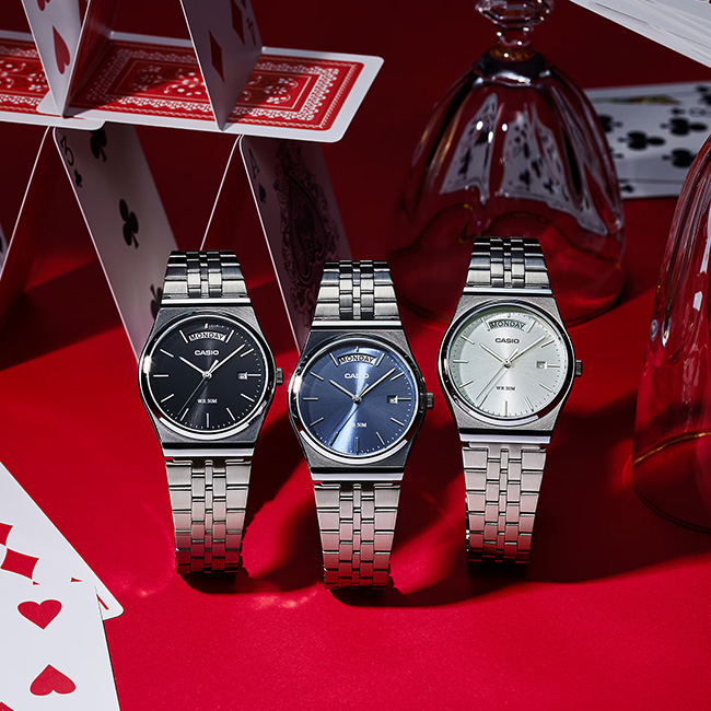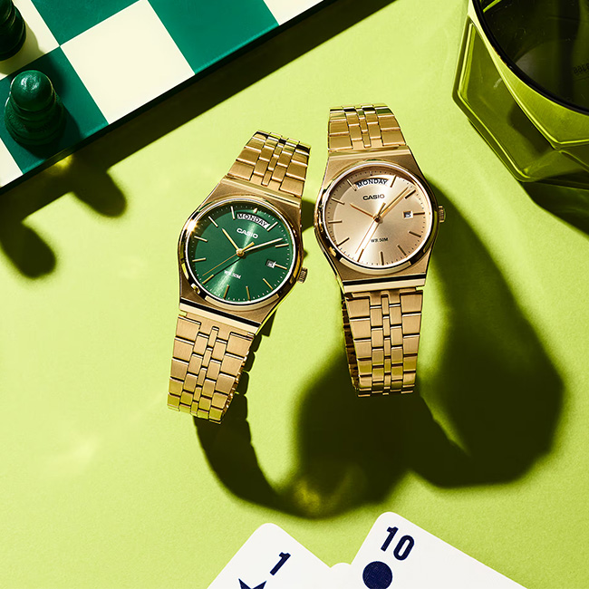 CASIO STANDARDIntroducing a new series of analog watches that capture the nostalgic appeal of 1980s design and color schemes. These retro-inspired models feature a distinctive window at 12 o'clock displaying the day of the week, which adds a unique design touch. A simple, uncluttered dial ensures easy readability while delivering a timeless aesthetic.