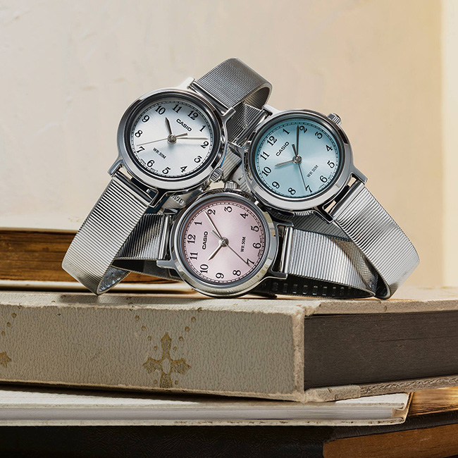 Introducing a collection of compact analog watches with retro-inspired bracelet design. With 50-meter water resistance, these stylish timepieces provide peace of mind, even during sudden rain showers.
