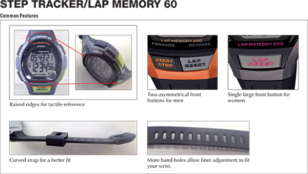 STEP TRACKERThese new models come with Step Tracker, which can be configured to start counting your steps automatically whenever you start jogging, running, or walking. The WS-2000 series for men and the LWS-2000 series for women each come in a choice of three models. These watches use a 3-axis accelerometer that starts counting your steps automatically when you start moving while wearing the watch. A Step Count Graph on the display shows your past step count along with your step count goal attainment rate, and the number of days your step count goal was attained. You can also maintain a history of your step counts over the past seven days. This and more make these watches the perfect tools to support management of your health and exercise. Memory is available for storage of up to 200 lap time records. During elapsed time measurement, you can display both elapsed time and the current time of day, and an LED light allows easy reading even in the dark. The tip of the band is curved to facilitate strapping these watches to the wrist, and there are more band holes to allow fine size adjustment for a better fit. A large front button along with raised ridges at the top and bottom of the display for tactile reference allow easier, fumble-free operation while on the move. Everything about these watches is designed and engineered to meet the modern needs of today's runners.