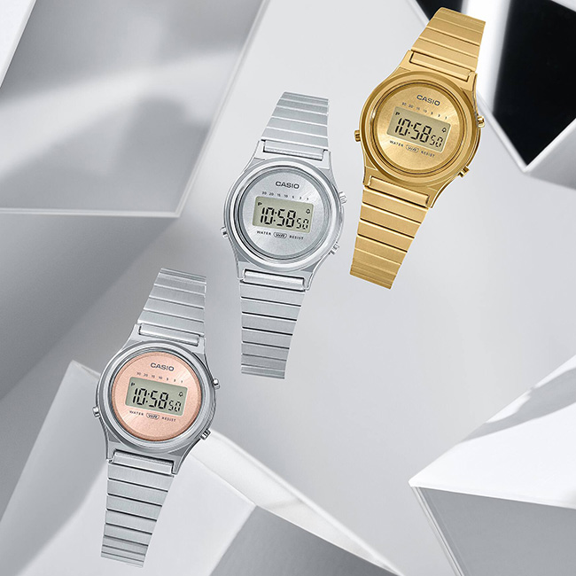 CASIO VINTAGEThe minimalist design of these models creates a sophisticated look. The small 26.3mm-diameter round case lets this watch function as an attractive accessory. The metallic sunburst dial adds a bit of sparkle and gives the watch a luxurious finish. These wathces also come with stopwatch and alarm functions that come in handy throughout the day.