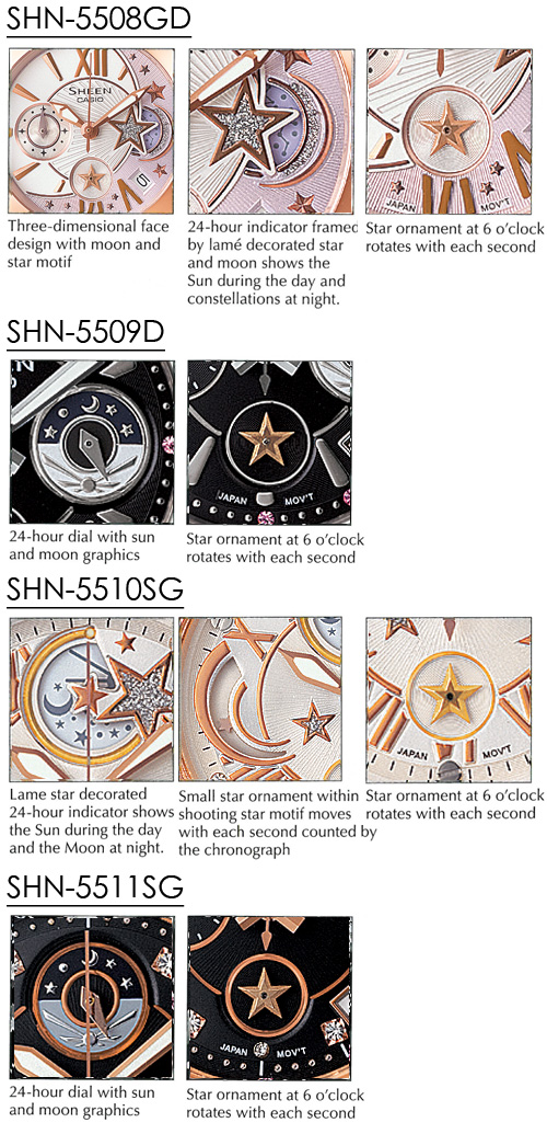 | Similar series Watch Series: | | | Sheen: Light yellow gold - SHE-4539BGM, SHE-4540GM Series (MAY 2024) | Sheen: SAPPHIRE CRYSTAL - SHE-4563D, SHE-4563GYL Series (FEB 2024) | Sheen: SAPPHIRE CRYSTAL - SHE-4562PGM, SHE-4562BM Series (JAN 2024) | Sheen: SAPPHIRE CRYSTAL - SHE-4554PGM, SHE-4554GYM Series (JUL 2023) | Sheen: SAPPHIRE CRYSTAL - SHE-4559D, SHE-4559GL Series (MAY 2023) | Sheen: SAPPHIRE CRYSTAL - SHE-4543D, SHE-4543BD Series (APR 2023) | Sheen: SAPPHIRE CRYSTAL - SHE-4543D, SHE-4543BD Series (JUL 2021) | Sheen: SAPPHIRE CRYSTAL - SHE-4541CGL, SHE-4541BL Series (NOV 2020) | Sheen: SAPPHIRE CRYSTAL - SHE-4539CGM, SHE-4539M Series (OCT 2020) | Sheen: SAPPHIRE CRYSTAL - SHE-4540CGM, SHE-4540M Series (OCT 2020) | Sheen: SAPPHIRE CRYSTAL - SHE-4538 Series (JUL 2020) | Sheen: SHE-4535YPG, SHE-4535YGL Series (JUN 2020) | Sheen: Mother of pearl dial - SHE-4060 Series (JUN 2020) | Sheen: SHE-3069PG Series (JUN 2020) | Sheen: Rose gold ion plated case - SHE-4534PGL Series (JAN 2020) | Sheen: SHE-4059PGM Series (JAN 2020) | Sheen: SHE-4533D, SHE-4533PG, SHE-4533PGL Series (NOV 2019) | Sheen: SHE-4057PG, SHE-4057PGL Series (NOV 2019) | Sheen: SHE-3068PG, SHE-3068SPG Series (NOV 2019) | Sheen: SHE-3806GL, SHE-3048PGL, SHE-3064PGL, SHE-3059PGL Series (OCT 2019) | Sheen: SHE-4532PG, SHE-4532PGL Series (AUG 2019) | Sheen: SHE-4056PG, SHE-4056SPG, SHE-4056PGL Series (JUL 2019) | Sheen: SHE-3061PG, SHE-3809PG Series (JUN 2019) | Sheen: SHE-3067PG, SHE-3067PGL Series (MAY 2019) | Sheen: SHE-3046PG, SHE-3047PG Series (APR 2019) | Sheen: SHE-4055PG, SHE-4055PGL Series (MAR 2019) | Sheen: SHE-3048PG, SHE-4034PG Series (JAN 2019) | Sheen: SHE-3034GL, SHE-3046GLP, SHE-3056PGL, SHE-3058PGL Series (JAN 2019) | Sheen: SHE-3066PG, SHE-3066PGL Series (NOV 2018) | Sheen: SHE-4052PG, SHE-4052PGL Series (NOV 2018) | Sheen: SHE-3802D, SHE-3802L, SHE-3802GL Series (NOV 2012) | Sheen: CRUISE LINE - SHE-5513L Series (NOV 2012) | Sheen: SHE-5018L, SHE-4028 Series (NOV 2012) | Sheen: SHE-3024, SHE-3025 Series (OCT 2012) | Sheen: Tonneau-shaped case looks - SHE-4027D Series (OCT 2012) | Sheen: CRUISE LINE, Ceramic Bezel - SHE-4505D Series (OCT 2012) | Sheen: CRUISE LINE, Ceramic Bezel - SHE-5517D Series (OCT 2012) | Sheen: Pink gold and pink face design Series (JUL 2012) | Sheen: Fine resin bracelet - SHE-3023 Series (JUN 2012) | Sheen: CRUISE LINE, Solar Powered - SHE-3501SBD Series (JUN 2012) | Sheen: Fine resin bracelet - SHE-4024 Series (JUN 2012) | Sheen: Solar Powered- SHE-4025SB, SHE-4026SB Series (JUN 2012) | Sheen: Cruise line, SHE-3500, SHE-4501 Series (APR 2012) | Sheen: Cruise line - SHE-4502SBG,SHE-4503SBD Series (APR 2012) | Sheen: SHE-4024, SHE-3023 Series (APR 2012) | Sheen: Gwei Lun-Mei Limited Edition - SHE-5515BD-1A Series (DEC 2011) | Sheen: Cruise Line - SHE-5515D-7A Series (DEC 2011) | Sheen: Chronograph SHE-5024BL Series (DEC 2011) | Sheen: CRUISE LINE - SHE-4500D Series (OCT 2011) | Sheen: CRUISE LINE - SHE-5516 Series (OCT 2011) | Sheen: Chronograph SHE-5021 Series (OCT 2011) | Sheen: Chronograph SHE-5020 Series (OCT 2011) | Sheen: Gwei Lun-Mei Limited Edition - SHE-5020BL-1A Series (OCT 2011) | Sheen: Cruise Line SHE-5514D Series (JUL 2011) | Sheen: Gwei Lun-Mei Limited Edition Series (MAY 2011) | Sheen: Ceramic Bezel SHE-5512 Series (APR 2011) | Sheen: Chronograph - SHE-5017/SHE-5018 Series (APR 2011) | Sheen: Petit, feminine desgn - SHE-4021 Series (APR 2011) | Sheen: Solar Powered - SHE-3022SBD Series (APR 2011) | Sheen: Gwei Lun-Mei Limited Edition Series (APR 2011) | Sheen: Petit, feminine design Series (OCT 2010) | Sheen: Moon-shaped date indicator disk Series (OCT 2010) | Sheen: Cruise Line - SHN-5507D Series (JUN 2010) | Sheen: Colorful rhinestone hour markers Series (JUN 2010) | Sheen: Colorful rhinestone hour markers Series (JUN 2010) | Sheen: Colorful rhinestone hour markers Series (JUN 2010) | Sheen: Cruise Line - SHN-5506 Series (APR 2010) | Sheen: Classical cut glass - SHN-5010/SHN-5011 Series (APR 2010) | Sheen: Mother of pearl face - SHN-3014/SHN-4019 Series (APR 2010) | Sheen: Slim, feminine design Series (DEC 2009) | Sheen: Chronograph - Luxury Resort Series (OCT 2009) | Sheen: Inlaid star motif Series (OCT 2009) | Sheen: Rhinestones-studded Series (OCT 2009) | Sheen: Slim, feminine design Series (OCT 2009) | Sheen: Chronograph - Luxury Resort Series (JUN 2009) | Sheen: Star Motif Series (JUN 2009) | Sheen: Star Motif Combination Series (MAY 2009) | Sheen: Star Motif - Cosmos Series (MAY 2009) | Sheen: Flagship model of 2009 Series (APR 2009) | Sheen: Star Motif Series (APR 2009) | Sheen: Adult-Oriented Series (FEB 2009) | Sheen: Generous Rhinestones Bright Series (FEB 2009) | Sheen: Luxury Series (NOV 2008) | Sheen: Graceful Sheen Series (OCT 2008) | Sheen: Luxurious Hearts Series (OCT 2008) | Sheen: Seaside Resort Design Series (JUN 2008) | Sheen: Seaside Resort Design Series (MAY 2008) | Sheen: Milky Way face Series (MAY 2008) | Sheen: Crystal Components Series (MAY 2008) | Sheen: CHRONOGRAPH Series (APR 2008) | Sheen: Rhinestones Series (NOV 2007) | Sheen: S.H.E Limited Edition Series (NOV 2007) | Sheen: Rhinestones Series (OCT 2007) | Sheen: Analog-Digital Series (OCT 2007) | Sheen: MULTI-HAND Series (MAY 2007) | Sheen: DIGITAL Series (MAY 2007) | Sheen: Lastest Additions to the Sheen lineup of elegant Series (FEB 2007) | Sheen: Crystal Components Series (OCT 2006) | Sheen: Three-fold buckle Series (SEP 2006) | Sheen: Fashionable design Series (SEP 2006) | Sheen: Rhinestone (SHN-4003) Series (JUN 2006) | Sheen: Rhinestone (SHN-4004) Series (JUN 2006) | Sheen: Crystal Components Series (JUN 2006) | Sheen: Chronograph Series (APR 2006) | Sheen: Digital Bracelet Series (FEB 2006) | Sheen: Business and formal wear Series (DEC 2005) | Sheen: SHN-1000 Series (SEP 2005) | Sheen: SHN-1001 Series (SEP 2005) | Sheen: Super Illuminator Series (SEP 2005) | Sheen: Multi-hand Series (SEP 2005) | | |