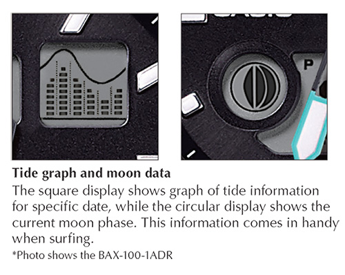 G-LIDE 25th Anniversary Model - BAX-125-2This new model marks the 2019 25th birthday of the BABY-G watch for active women. Basic white coloring is accented by blue and red coloring for a refreshing summertime look. The watch also comes with an additional white resin band that lets you change your wrist look to suit your mood or fashion. The nylon band has a patch marked with the text: "BABY-G 25TH ANNIVERSARY." Function-wise, this model always shows tide information, even while in the Timekeeping Mode. Each press of the button at 4 o'clock jumps ahead one hour to let you check future tide conditions. The index has a maritime design that enables easy readability. The special package of this model is marked with the same BABY-G 25th anniversary logo that appears on the back cover of the watch. All of this and more makes this special model the perfect choice for the summertime beach scene.
