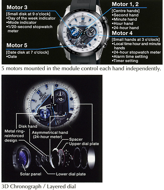 Chronograph radio-controlled Can receive signals from six different transmitters around the globe. Solar powered 100-meter water resistant EQW-M1001 5 independent motors for amazingly fast function switching Tachymeter powerful two-level face configuration layers two faces of highly contrasting designs with part of the top level cut away to reveal the lower level. Left dial uses a rotary disk to indicate the 1/20-second count of a stopwatch operation (one revolution per second). EQW-M710 Rotatable inner ling 5-motors chronograph Face designed for natural right-to-left reading of elapsed time measurement results. Right dial shows minutes and 1/1 seconds, small center dial hand indicates 1/10 seconds and makes one revolution per second, left dial hand indicates 1/100 seconds. Crown guard on 3 o'clock side highlights the sporty design. ECW-M300 Digital-analog combination face World time 5 Alarms Full Auto LED Light