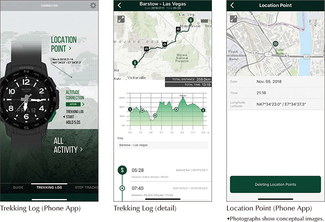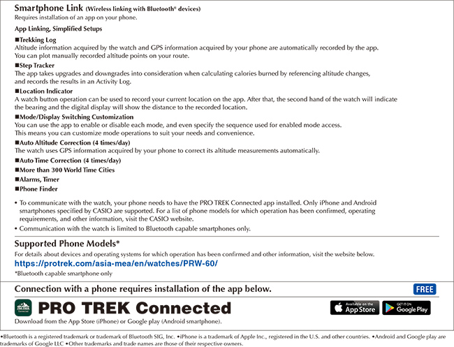 Climber Line Bluetooth - PRT-B50, PRT-B50FEPRO TREK's ability to combine the best that technology has to offer and innovative designs has made it the timepiece of choice for climbers, hikers, campers, and other outdoor enthusiasts. Now the PRT-B50 Series adds Bluetooth® capabilities that enable data communication with a smartphone running the PRO TREK Connected app, for the ultimate in ease of use. The Quad Sensor system uses compact sensors that make it possible to pack compass, altitude/barometer, and temperature measurements, along with an accelerometer that keeps track of your step count, into a compact configuration. Calorie calculations use both step count and altitude information to take upgrades and downgrades into consideration, and calories burned values are recorded by the app. The app automatically records altitude data measured by the watch and route information acquired by a smartphone's GPS, and you can manually plot altitude points along your route using a Trekking Log feature. You can also perform a watch button operation to record your current location in memory. Then after you move to a different place, a Location Indicator will point to the direction and display the distance back to the registered location. This makes it easy to determine the relationship between the two locations, which is an essential capability for outdoor activities. Smartphone connectivity simplifies configuration of settings, and Auto Time Adjust ensures that time settings are always correct no matter where you happen to be. The watch can also be configured to obtain altitude information using a smartphone's GPS and automatically correct its own altitude readings. When the watch connects with a phone, it also acquires latitude and longitude information, which is used to calculate the sunrise and sunset times for your current location. You can use the app to enable or disable modes individually so only the modes you need appear. You can even specify the sequence to be used when displaying the modes to suit your particular needs. The back cover of the watch, which is made of resin embedded with lightweight, tough glass fibers has a structure that combines the lugs connecting the band and the case into a single piece. Button guards protect against operational error and case toughness has been enhanced, which are essential features for rugged outdoor wear. A wide face with Arabic numerals provides easy, at-a-glance readability. The face combines with a large rotary bezel to create an attractive outdoor adventurer design. The cone of view bearing indicator that shows your current bearing uses metal parts for an outdoor accent that enhances the overall sporty design. The urethane band has a 3D texture to keep the band ring from slipping out of position, another feature that makes this watch suitable for outdoor use. The PRT-B50FE comes with a replacement cloth band that lets you slip it on over outer wear. The new PRT-B50's Bluetooth® connectability with a smartphone and customizable modes makes it the perfect choice for practical outdoor wear.