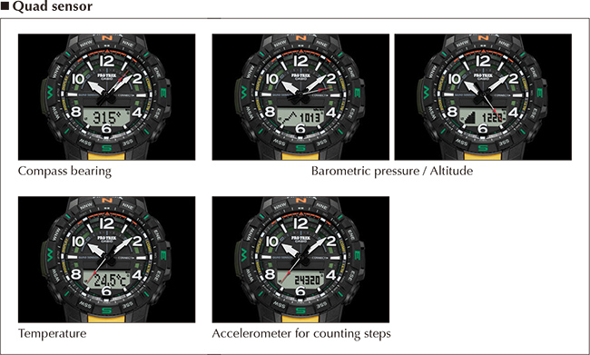 - Quad Sensor (Thermometer, Altimeter/Barometer, Digital compass, Step counter)