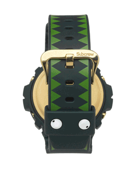 G-SHOCK SUBCREW Tie-up ModelSUBCREW is a a street fashion label that was established by Hong Kong actor, DJ, skateboarder, and rapper Sam Lee. The SUBCREW brand is currently enjoying tremendous popularity in Singapore, Hong Kong, and everywhere else through Asia. Now SUBCREW has teamed up with G-SHOCK to design a watch that incorporates some of the very best that both brands have to offer. Turning on the EL backlight causes a comical illustration of submarine, a motif that is maintained throughout the entire design (the name SUBCREW is derived from “submarine crew”), to appear on the display. The eyes of the submarine appear on the band loop and its teeth appear along the edges of the band. The back cover of the watch is engraved with the SUBCREW logo.