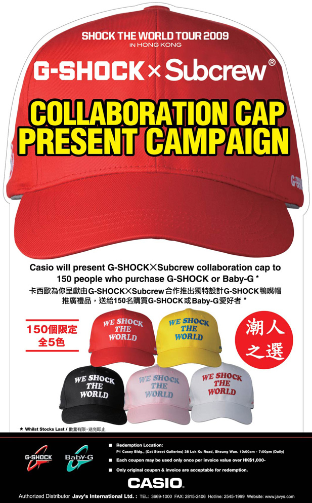 卡西歐為你呈獻由G-SHOCK X Subcrew合作推出獨特設計 G-SHOCK鴨嘴帽推廣禮品,送給150名購買G-SHOCK或 Baby-G愛好者 *