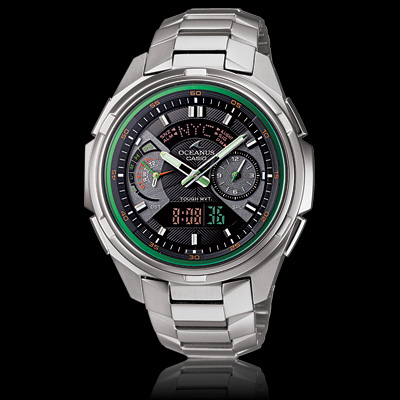 | | Analog: 2 hands (hour, minute (hand moves every 10 seconds)), 2 dials (world time, battery power indicator) Digital: Hour, minute, second, pm, month, date, day |
