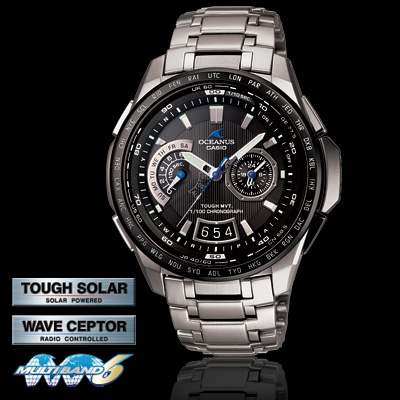 | | Analog: 3 hands (Hour, minute, (hand moves every 10 seconds), second), 2 dials (world time hour and minutes, day), date |