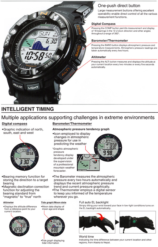 TRIPLE SENSOR200-meter water resistance for an expanded sphere of activityIntroducing new PRO TREK high-performance outdoor watch for various environments including mountain and ocean. This watch not only offers the compass bearing and altitude features necessary for mountain climbing, but also strong water-resistance for river climbing and river rafting where the user may encounter strong water pressure, as well as convenient tide information for sea kayaking and fishing. With a large display delivering outstanding readability, the PRG-250 has a dual-layer LCD construction. The sensor and other data are shown on the upper and lower LCDs, allowing the user to easily see the desired information. In addition to being displayed numerical and in a trend graph, atmospheric pressure is shown using simply designed arrow icons which depict characteristic barometric pressure patterns. This function was developed under the supervision of a meteorologist. Consequently, an upward arrow is displayed when the atmospheric pressure suddenly rises, forecasting better weather ahead. A downward arrow appears when the pressure suddenly falls, indicating weather deterioration. There are also arrow icons to show when rising pressure changes to falling pressure, or vice versa, making it easy to ascertain weather changes. - Tough Solar