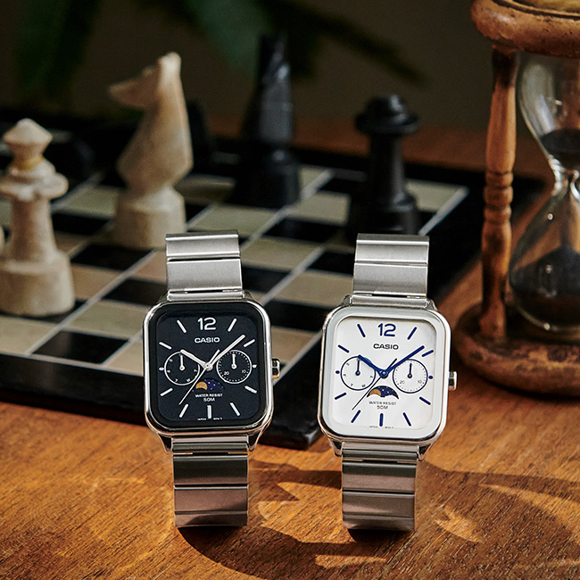 Standard Models - MTP-M300D, MTP-M305DThese multi-dial analogs incorporate the image of the Moon into stylish designs to make them great choices for coordination with both business and casual styles. They are all water resistant up to 50 meters for worry-free wear in sudden rain showers or while around water.