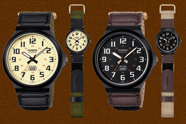 Big-case analogs - MW-240BThese new simple, big-case analogs come with hook-and-loop fastener bands. The orange accents of the dial and the earth-colored bands are reminiscent of outdoor scenes. These models are water resistant up to 50 meters, which is plenty of protection for everyday use.