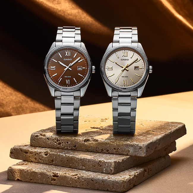 These three-hand metal analogs come in a choice of calm, chic colors.The MTP-1302DD models feature a sunburst dial, while the MTP-1302DS comes with a mother-of-pearl dial.All three models have a date display at 3 o'clock.