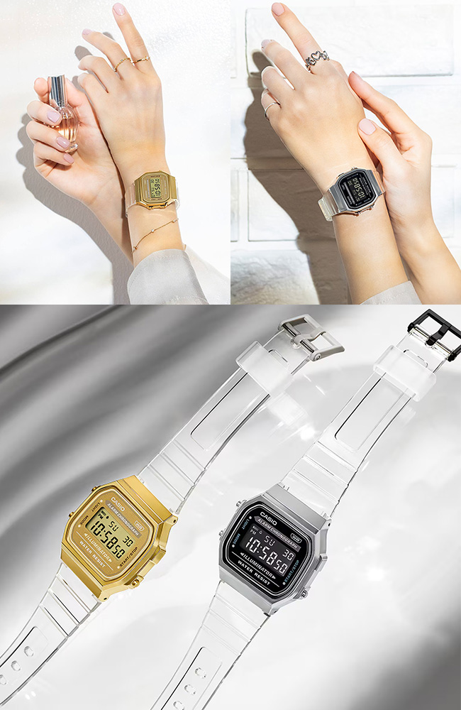 CASIO VINTAGE - A-168XES, A-168XESGThe designs of these digital watches combine metallic-look cases with semi-transparent bands for a look that allows them to be worn like chic fashion accessories. The A168 base model has maintained the same design that it had when it hit the market back in the late 1980s. In 2011, this watch won the Good Design Long Life Design Award. The timelessly simple square face of the A168 is now available in two-tone silver and black (A168XES) and one-tone gold (A168XESG). In addition to the design, these watches also deliver the practical functionality inherent in the digital format. They come equipped with an EL backlight, stopwatch, alarm, and other functions that come in handy during daily life, and all backed up by seven-year battery life.