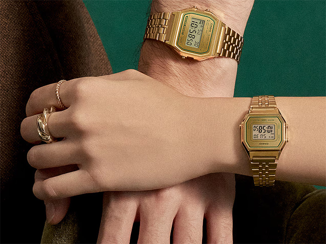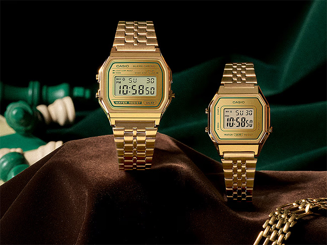 CASIO VINTAGEIntroducing a classic model with a striking gold and green color scheme. This model is based on the long-selling and popular A158 and the popular LA680. The unisex color palette features a gold base with green accents on the face, creating a timeless look. The multi-row band has a matte finish, adding a touch of sophistication, and the vapor-deposited coloring of the glass enhances the watch's visual impact. Practical functions include an LED backlight, stopwatch, and alarm.